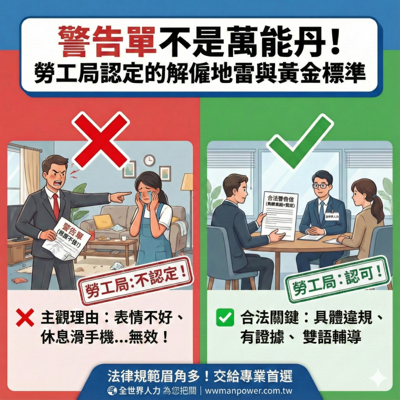 開立警告單只是手段,最終目的是希望移工改善,或是為了合法解約做準備。這中間的分寸拿捏非常重要,一不小心就可能從「有理」變成「違法」。